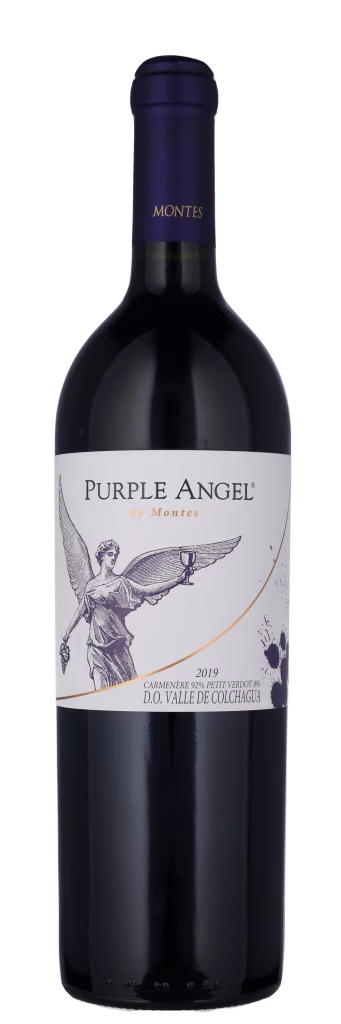 Purple Angel er lavet af Montes’ bedste Carmenère-druer (92%), hvor halvdelen kommer fra Apalta ejendommen, hvor de solbeskinnede druer giver elegance til vinen. Den anden halvdel kommer fra El Arcángel de Marchigüe ejendommen, der ligger nærmere kysten, hvor druerne giver kraft og koncentration. Begge ligger i Colchagua Valley. Carmenère tilsættes 8% Petit Verdot for at øge kompleksiteten i vinen og give den en bedre struktur. Udbyttet holdes helt nede på 3,5-4 tons pr. hektar. Vinen modner i 18 måneder på 80% nye og 20% et og to år gamle franske barriques, inden den aftappes med en let filtrering.